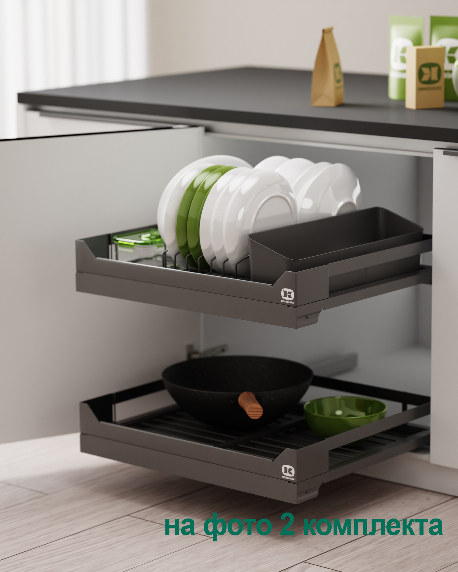 2 модуля для посуды большие (423 x 248 мм, каждый модуль состоит из 1 х держатель металлический, 1 х поддон пластиковый, 2 х защелка-ограничитель)